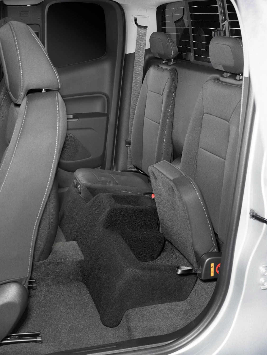 The Colorado/Canyon offers a great combination of real truck capabilities from within a compact platform. The Extended Cab version of this mid-size truck has limited back seat space for passengers and does not leave much room for a bulky subwoofer enclosure.