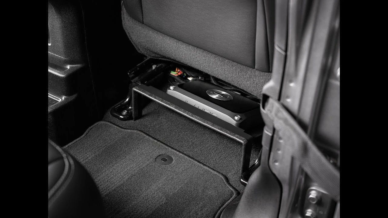 The SBA-J-JLU-UAR Universal Amplifier Rack fits under either front seat to securely mount one of several different JL Audio amplifier models (sold separately). Featuring an angled design to maximize rear seat foot space, the SBA-J-JLU-UAR Amplifier Rack requires no drilled holes and installs using factory hardware. Engineered and Built in USA.