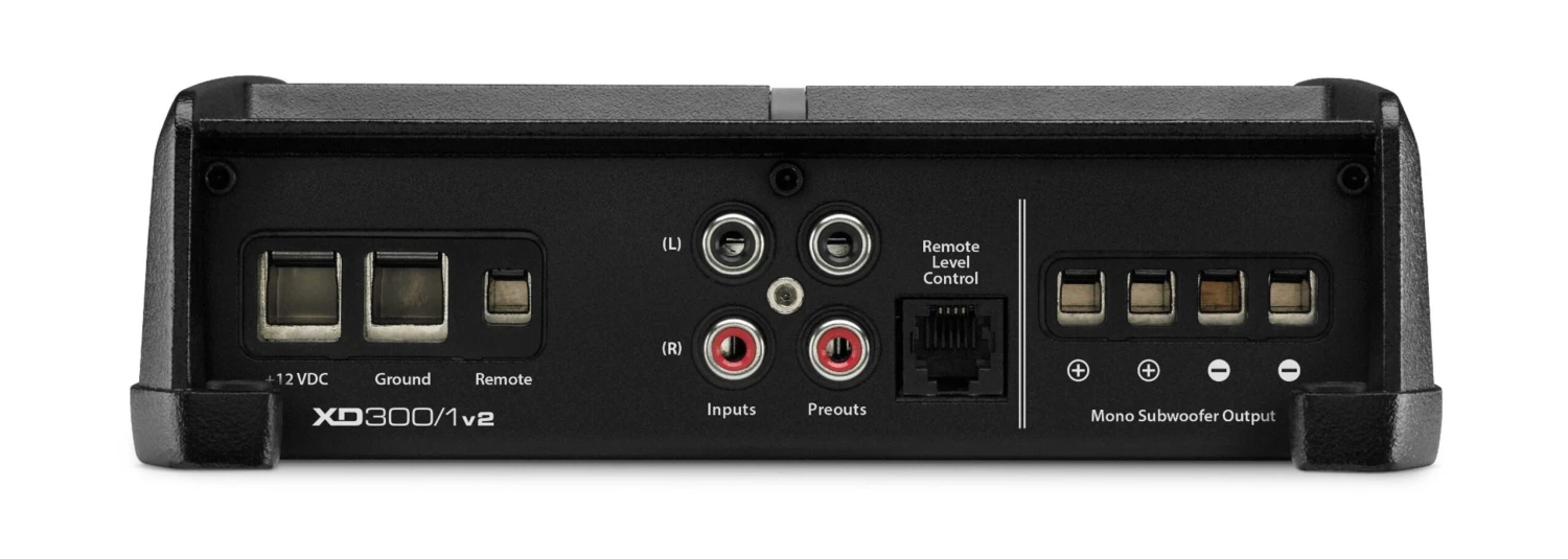 The XD300/1v2 also features the v2 Spec feature set, which consists of automatic turn-on capability (via signal sensing or DC-offset sensing), and a dual-range differential-balanced input section able to handle a wide range of input voltage levels. With the addition of an HD-RLC remote level control (sold separately), the amplifier’s level can be directly controlled from the driver’s seat.
